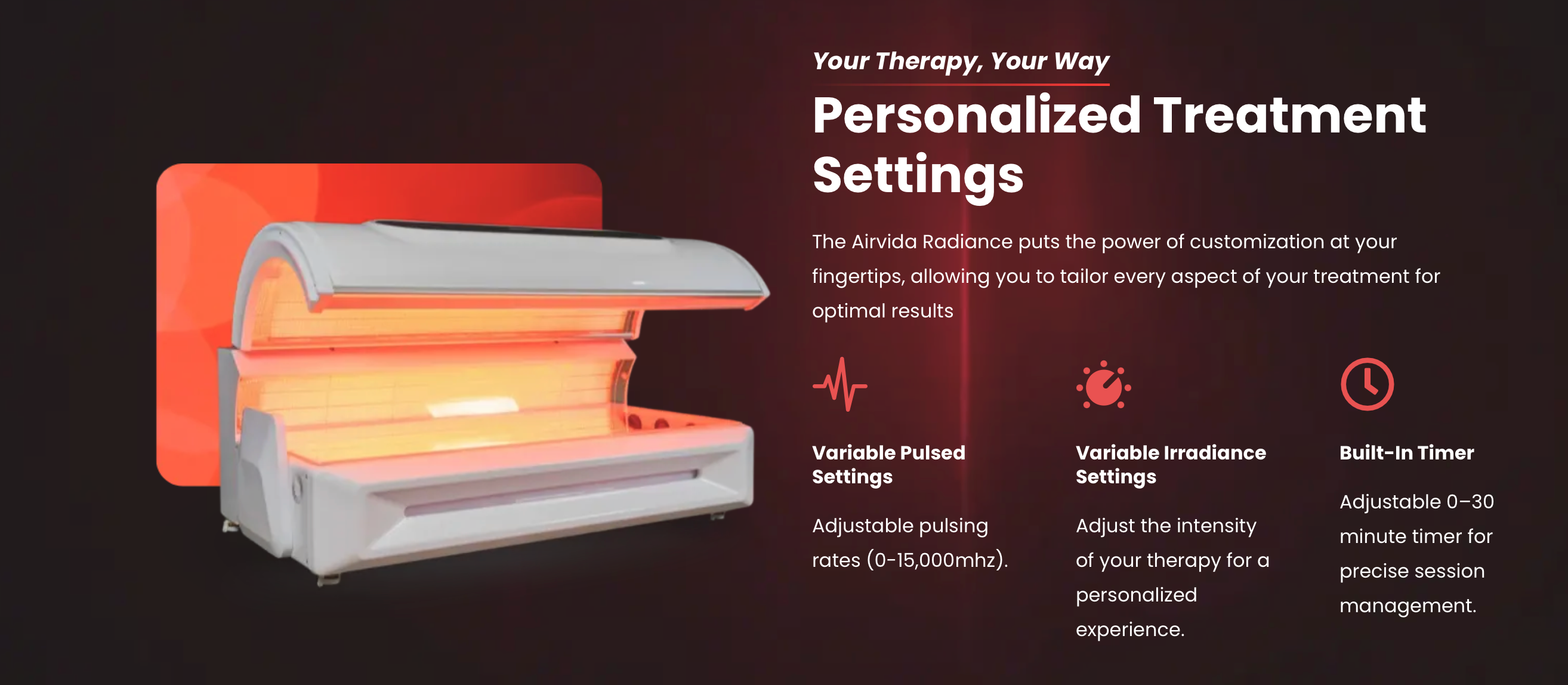 Step into the Airvida 6 Red Light Therapy Bed, a premium 360° LED therapy platform engineered for both personal and commercial wellness settings. Designed around six adjustable panels, it envelops your body in therapeutic red and near-infrared light, targeting deep tissue, skin, joints, and more.