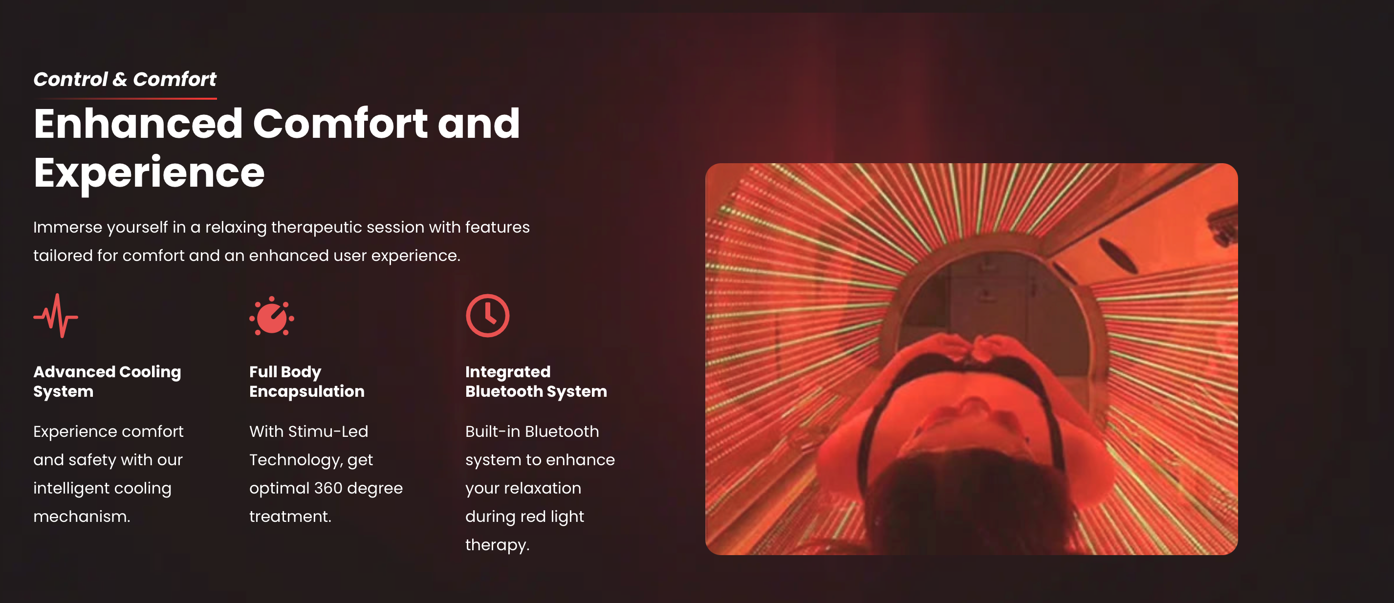 With 18,000 LEDs, this bed offers among the highest LED densities in its category, ensuring even light exposure from head to toe. Each wavelength (633, 660, 810, 850, 940 nm) can be controlled independently — allowing you to tailor sessions to skin health, muscle recovery, or deeper cell repair.